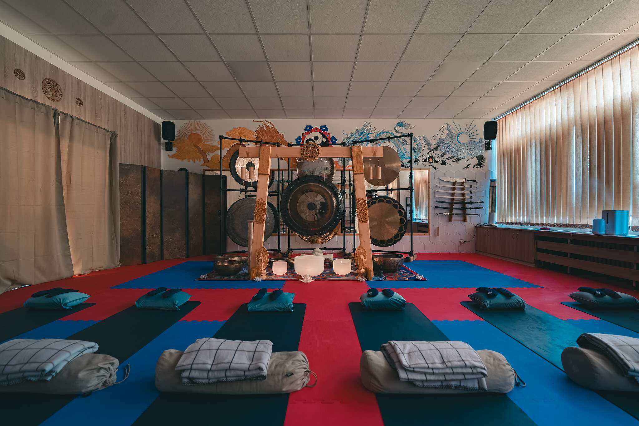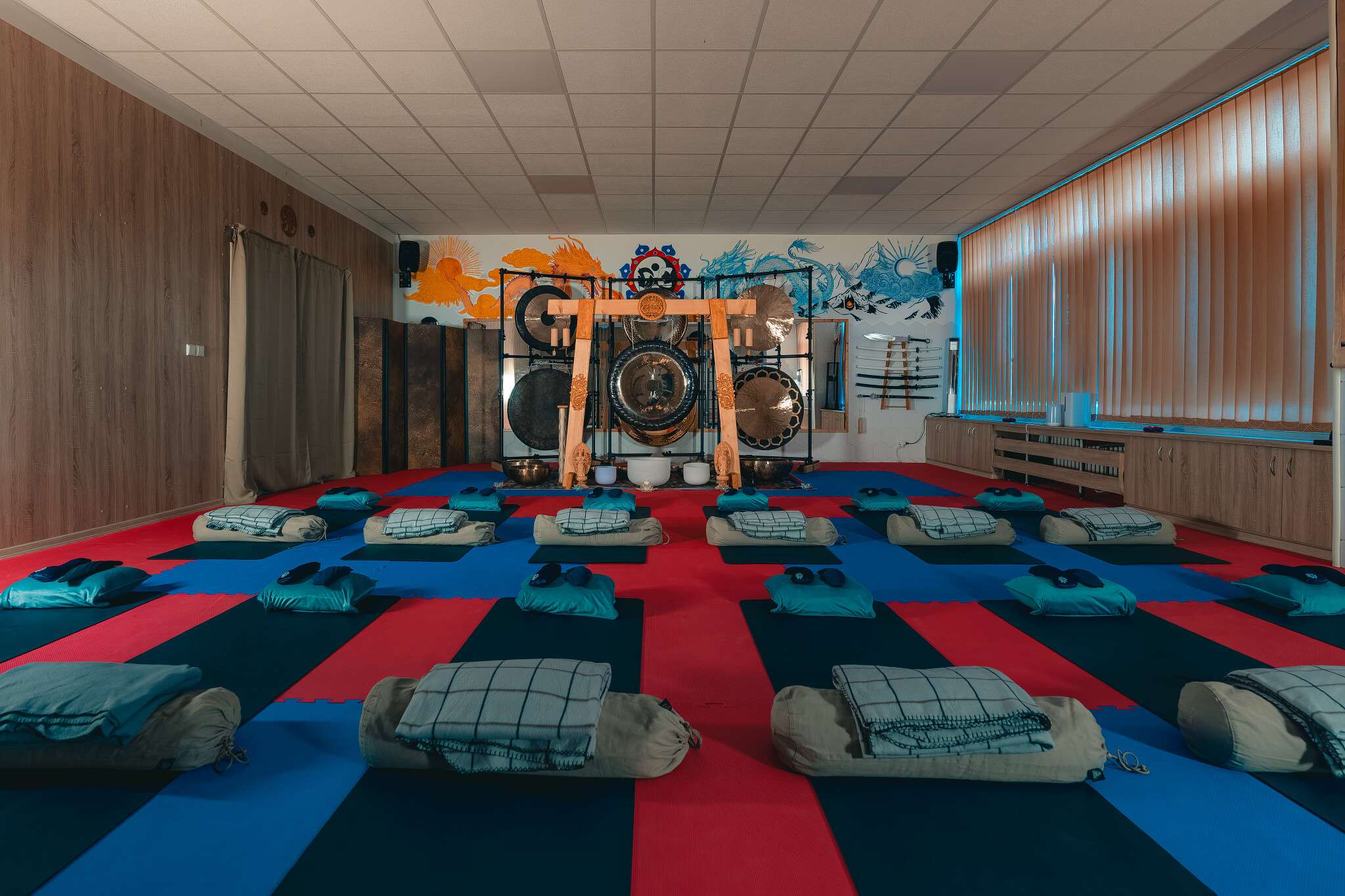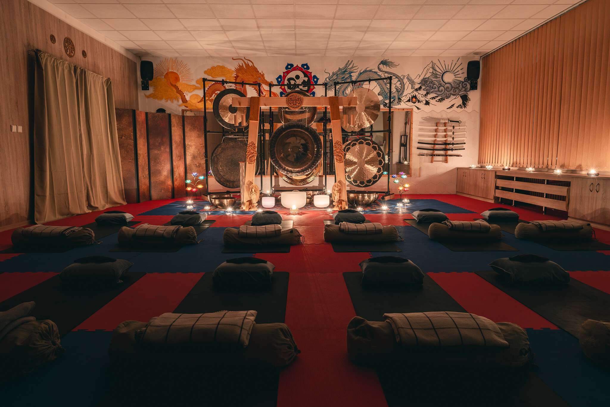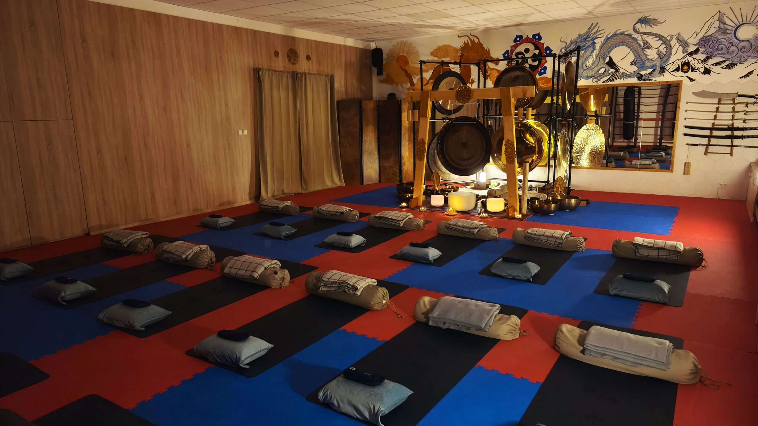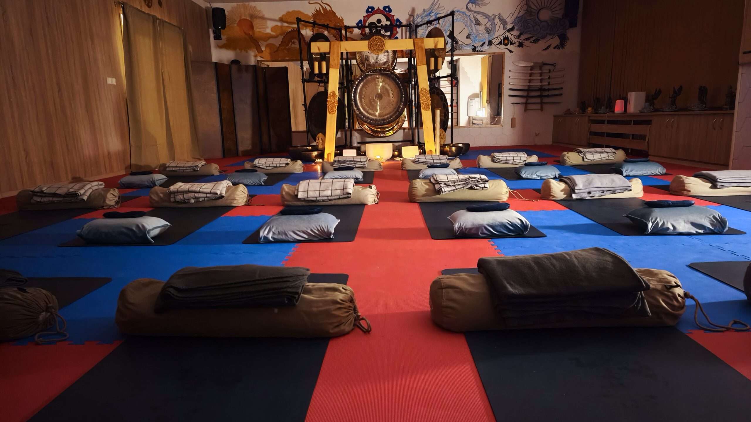V sále jsou položené tatami, ale v případě zájmu si můžete vzít své jógamatky a k tomu deku na přikrytí u meditace/polštář, masku na oči.
