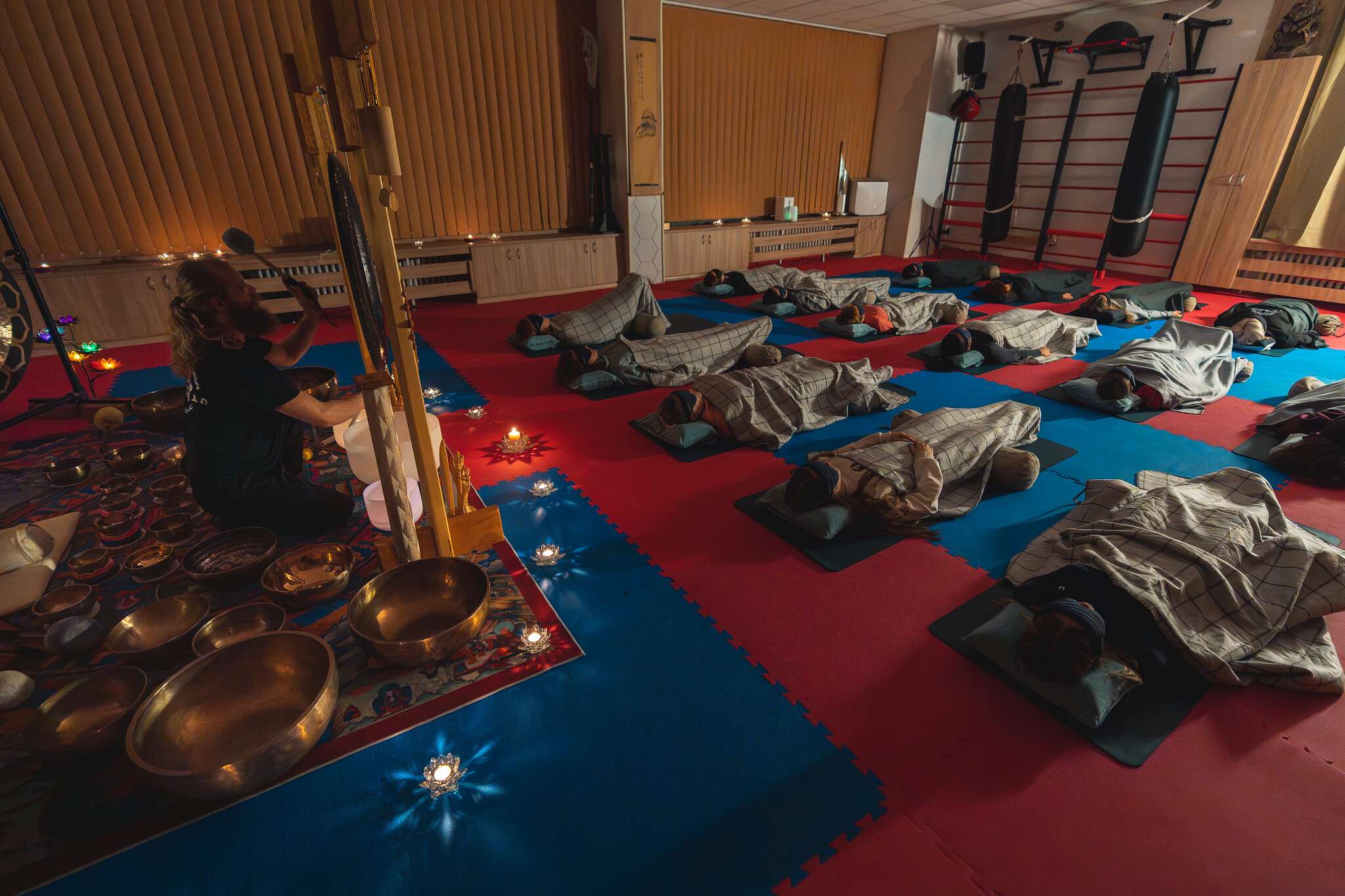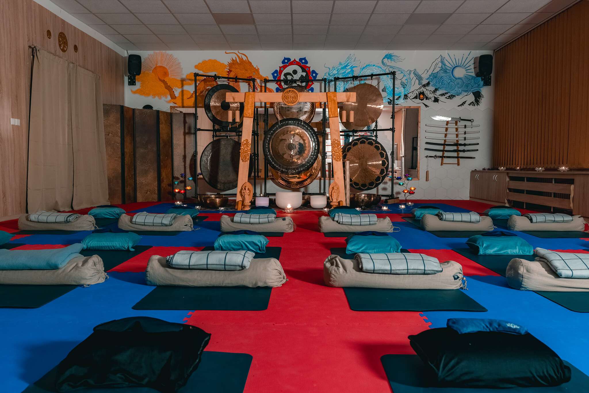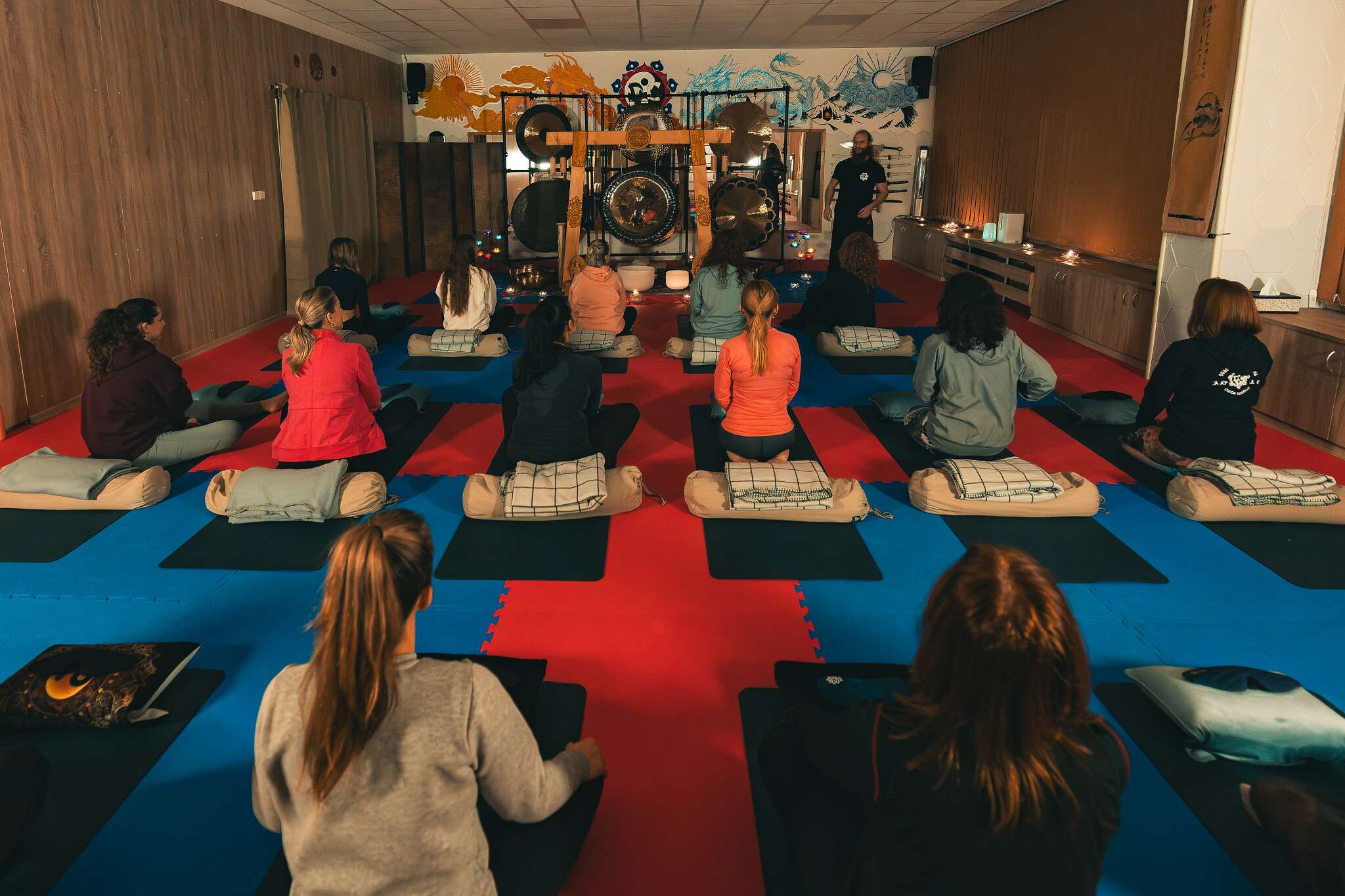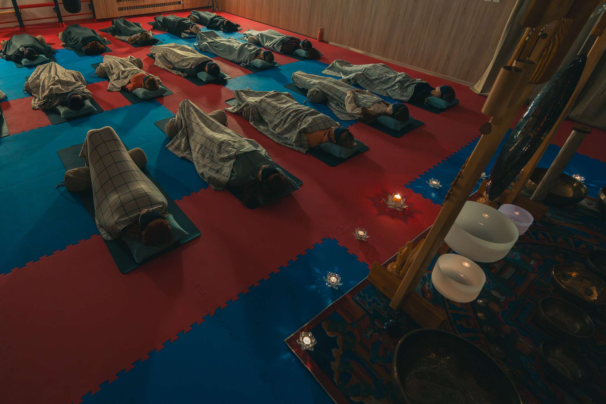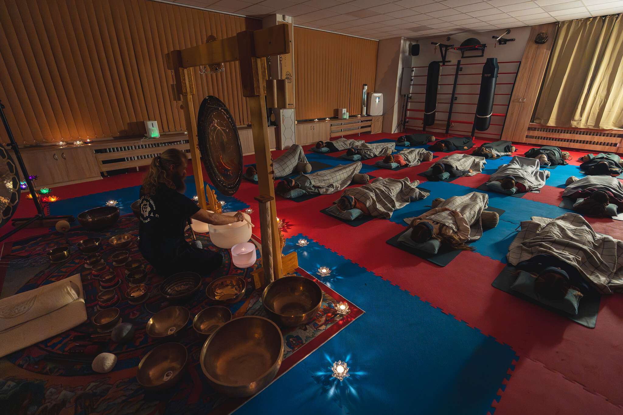 V sále jsou položené tatami, ale v případě zájmu si můžete vzít své jógamatky a k tomu deku na přikrytí u meditace/polštář, masku na oči.
