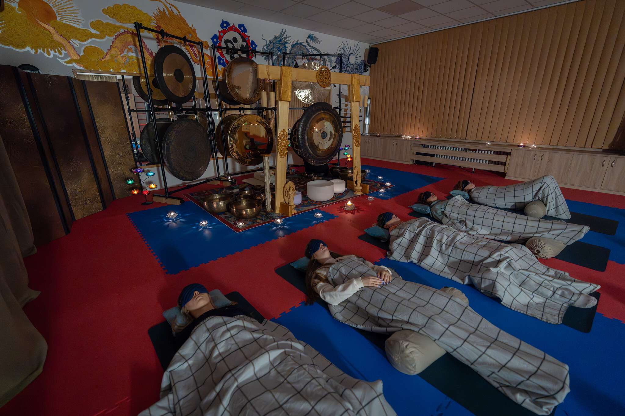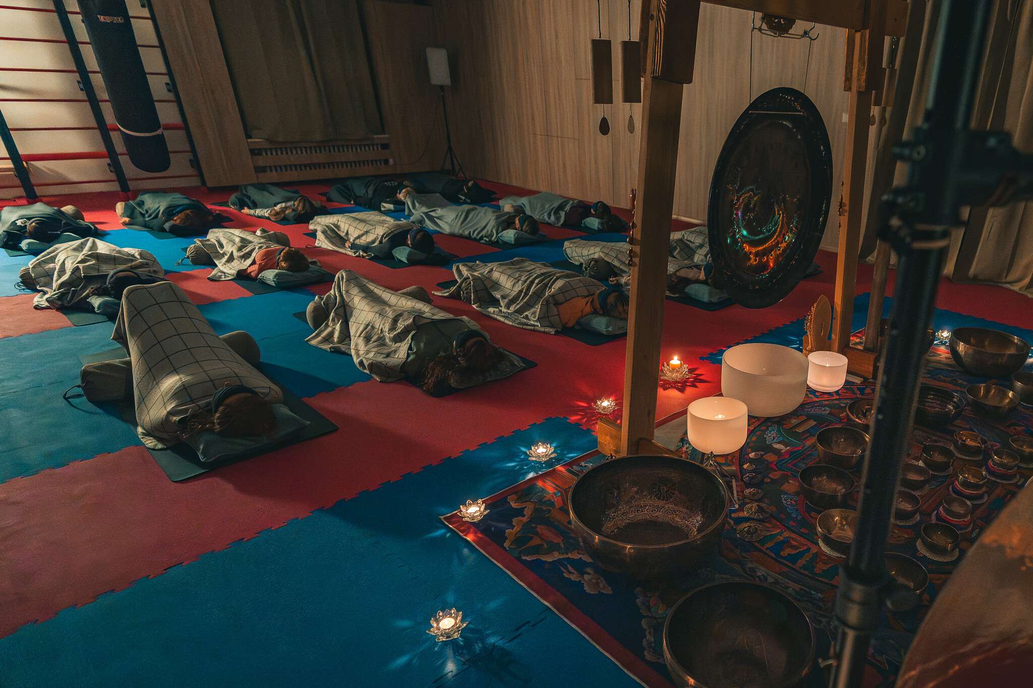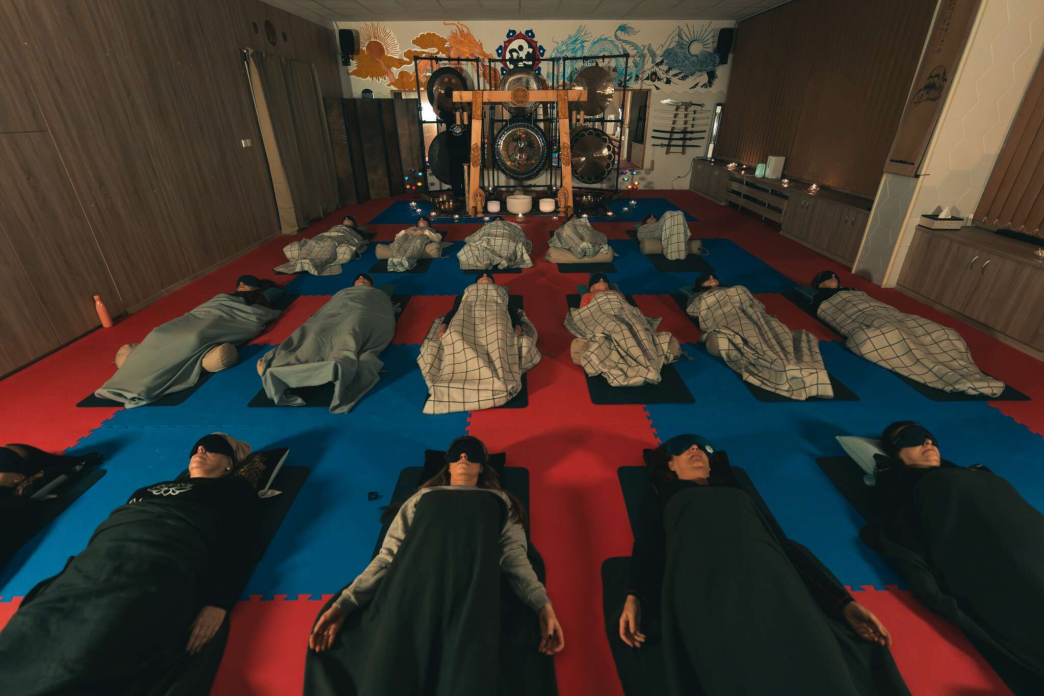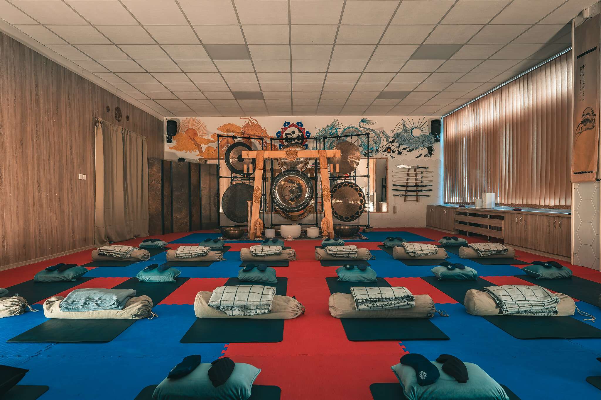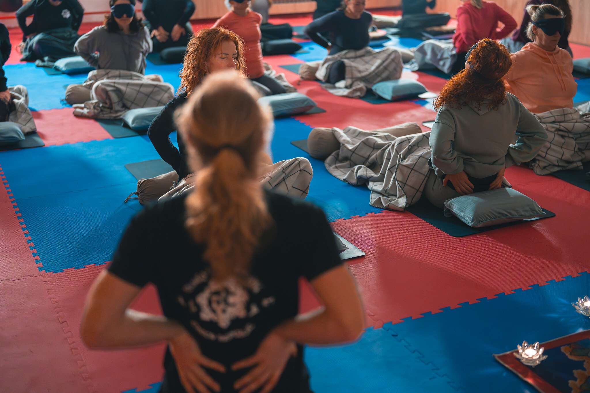 V sále jsou položené tatami, ale v případě zájmu si můžete vzít své jógamatky a k tomu deku na přikrytí u meditace/polštář, masku na oči.