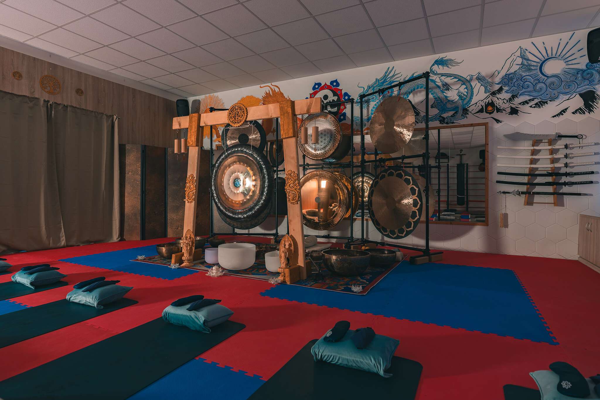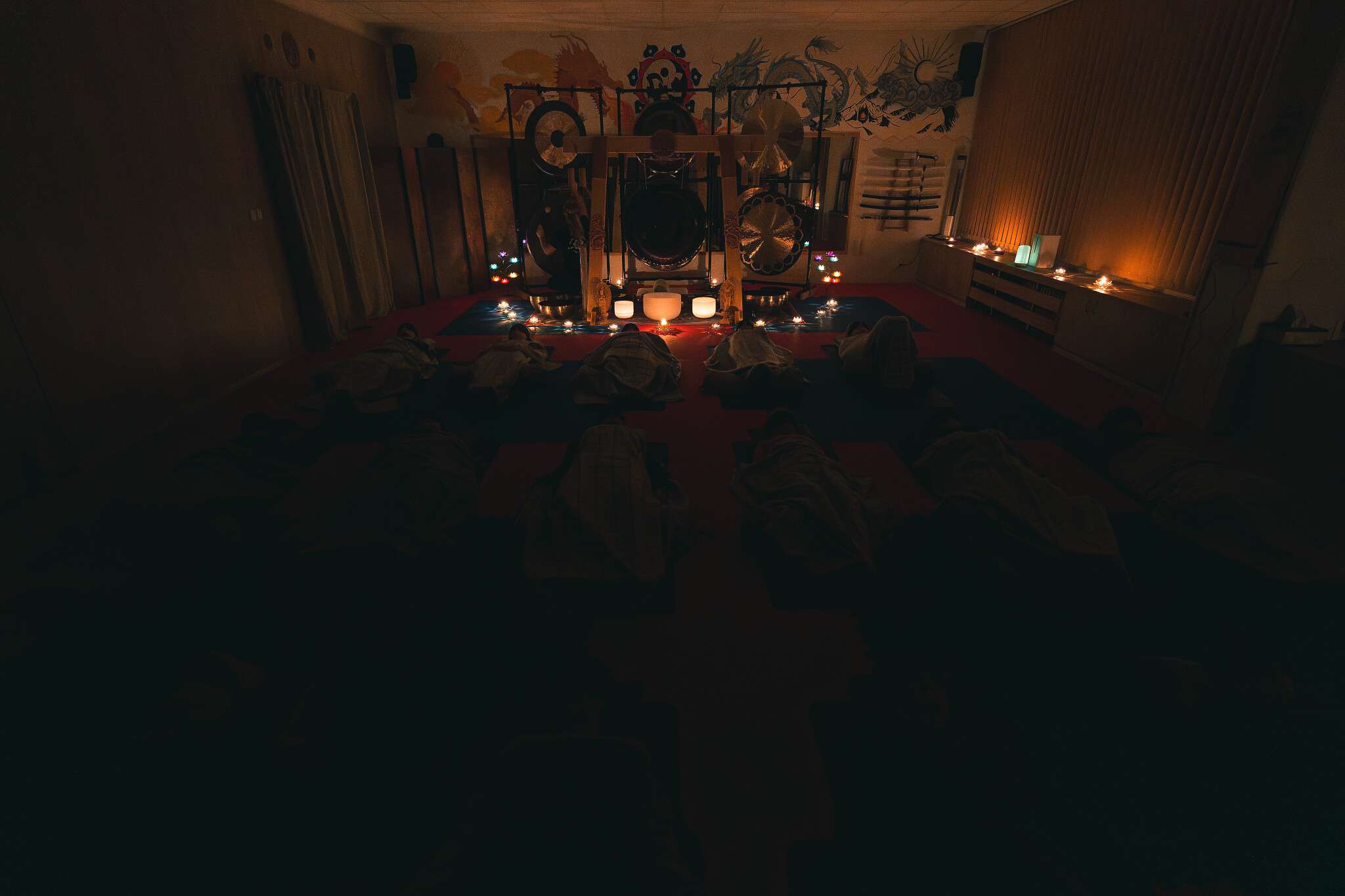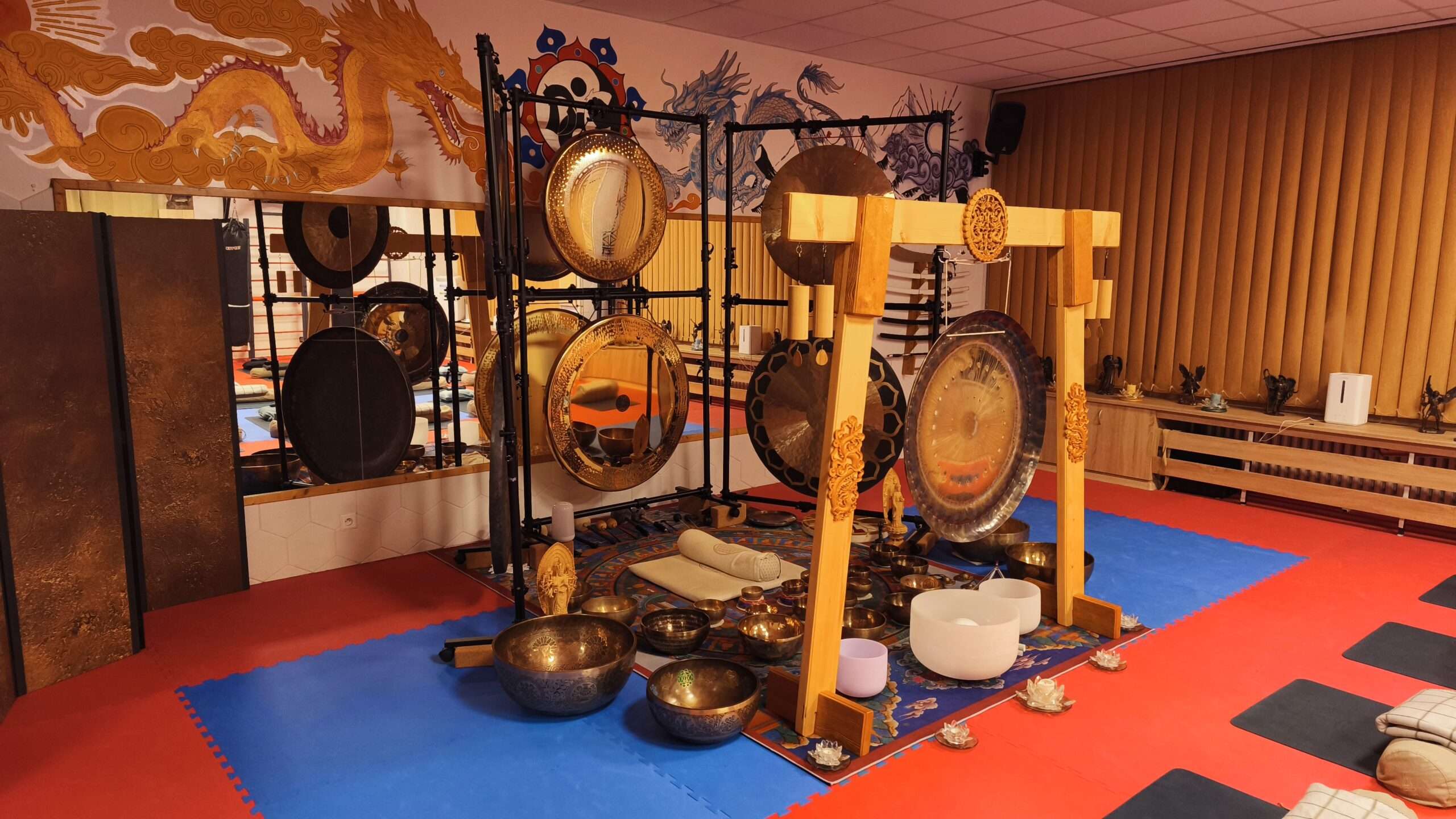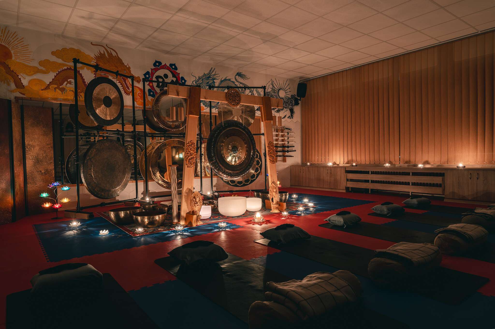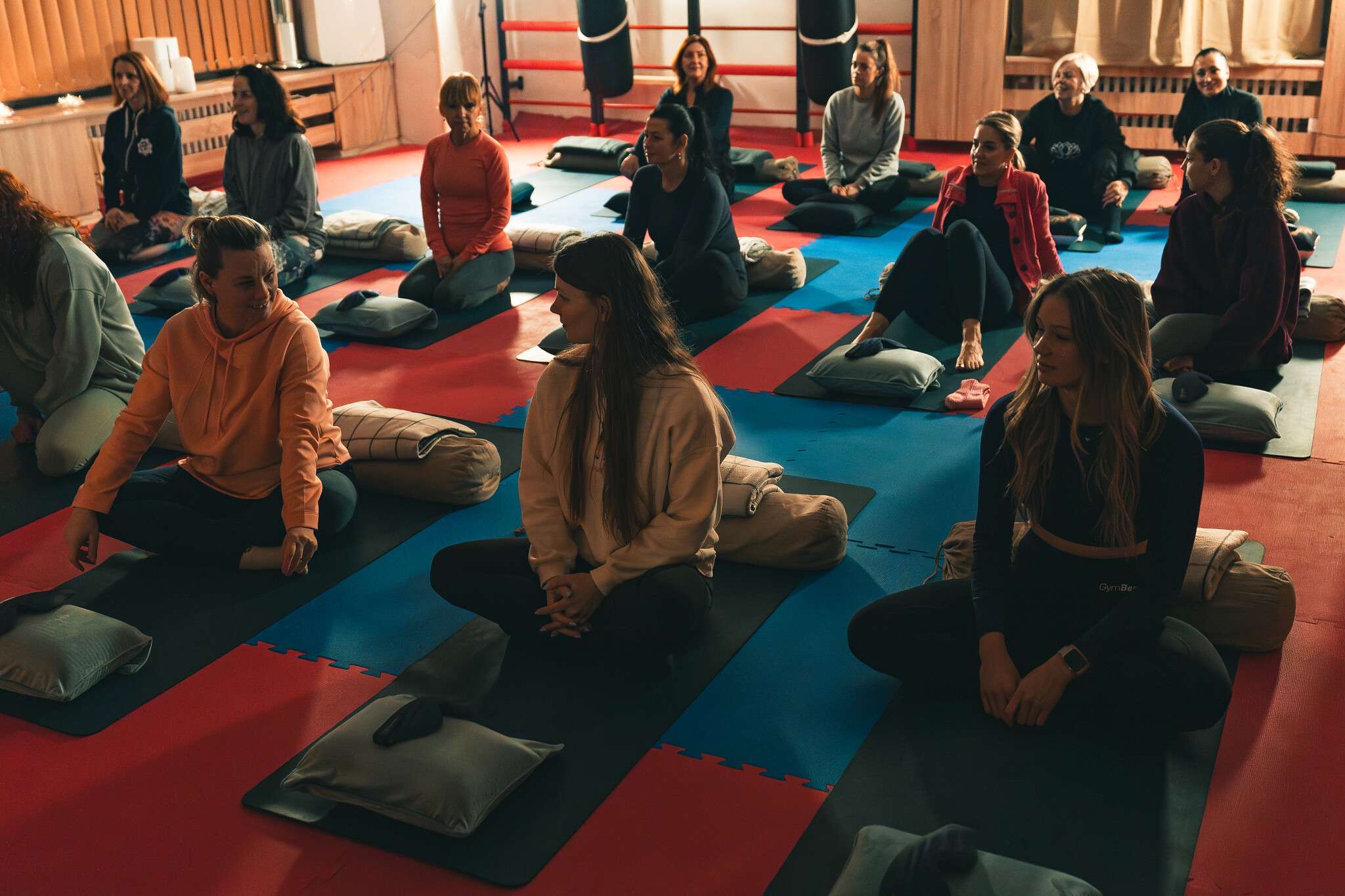 V sále jsou položené tatami, ale v případě zájmu si můžete vzít své jógamatky a k tomu deku na přikrytí u meditace/polštář, masku na oči.